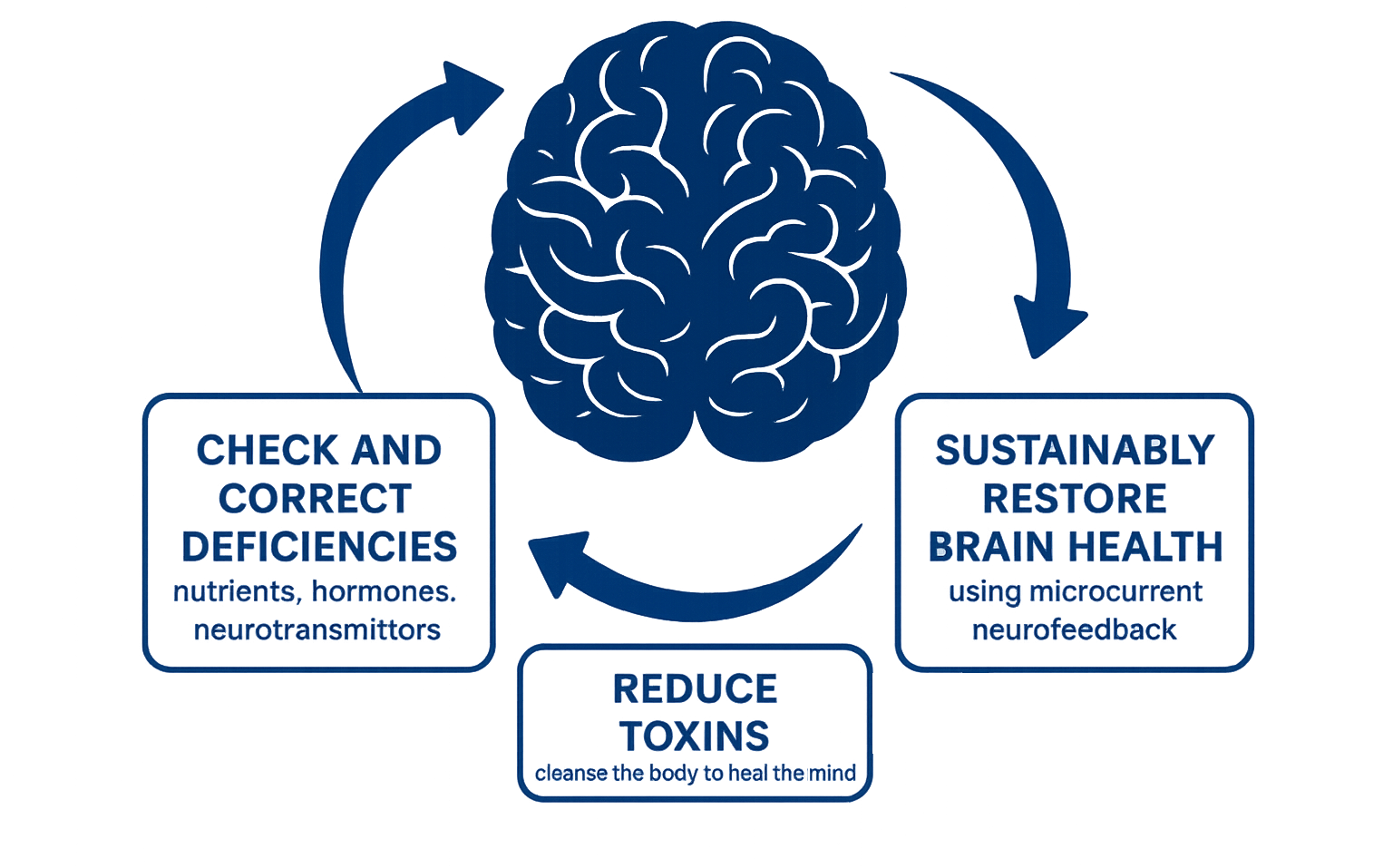 Fast, temporary fixes may sound enticing, but often lead to even bigger issues down the road. We focus on long-term sustainable solutions that address the root causes. We don’t believe in putting a patch over an issue. We want to revolutionize the way of approaching brain health... offering natural, long-lasting solutions to get you thriving again. We’ve put together a team of experts with decades of experience to not only address root causes and restore the mind/body but also offer common sense and knowledgable support every step of the way. This medical support can include supervised reduction of medications as appropriate. Let’s dive into how this all comes together…